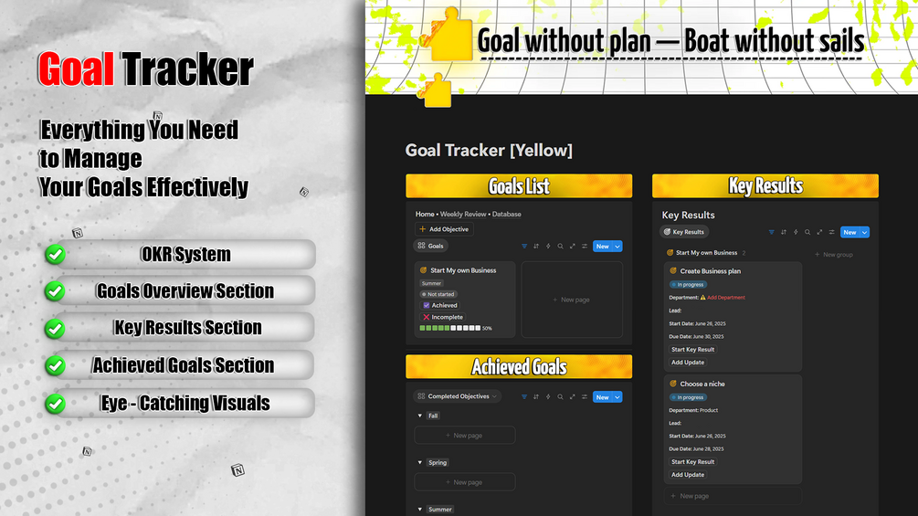 Here’s the truth: reaching your goals is tough without a plan and regular check-ins. But with this Goal Tracker template, everything falls into place, making progress easier than ever.